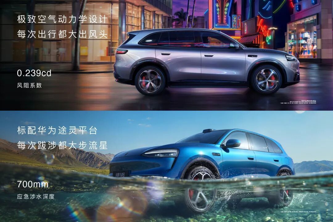 问界M6车身尺寸4960×1985×1736mm,轴距2950mm,定位中大型SUV。新车风阻系数仅为0.239cd,标配华为途灵平台,应急涉水深度可达700mm。